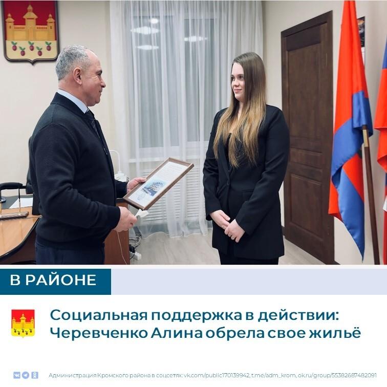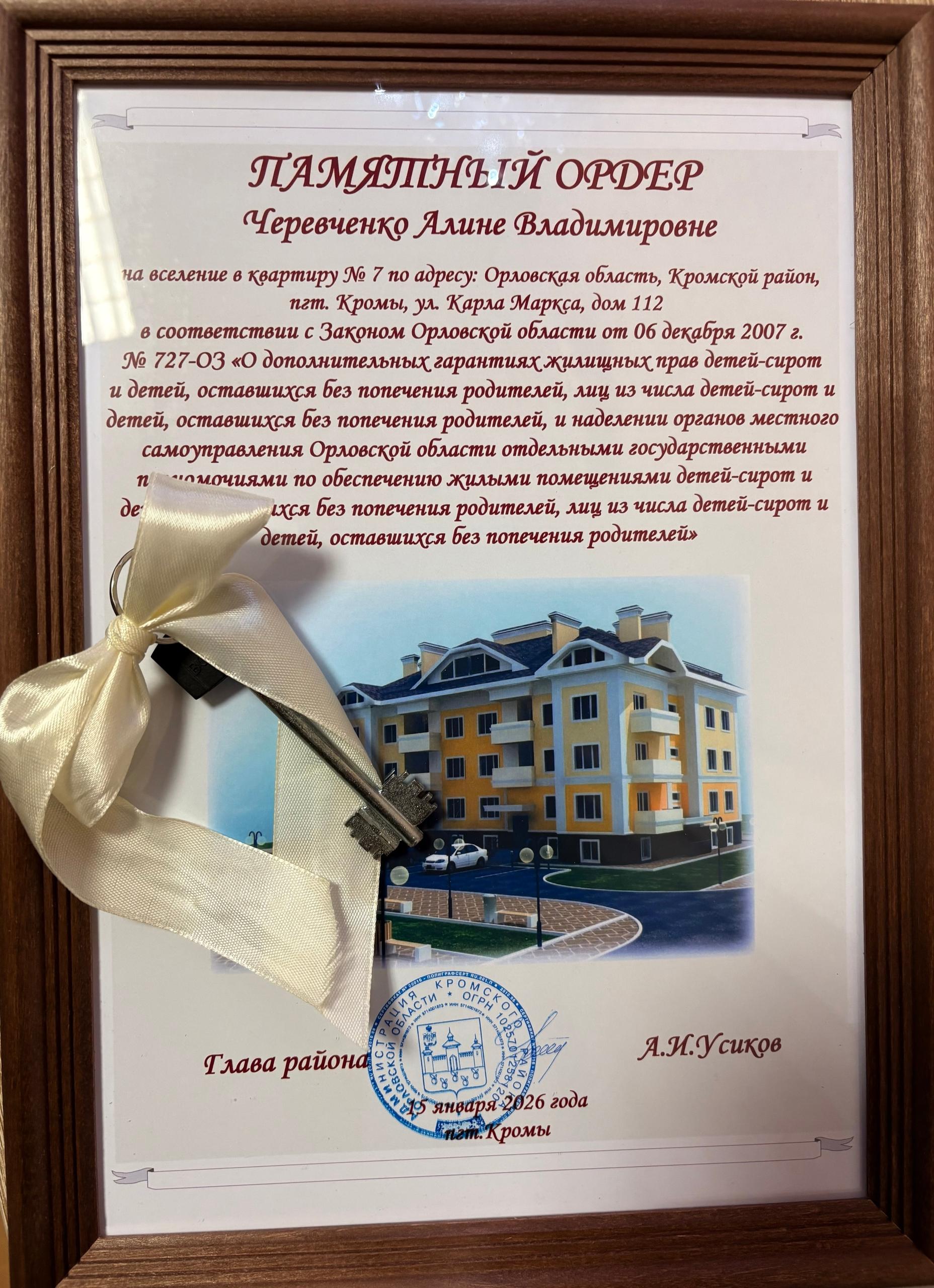 15 января 2026 года Глава Кромского района вручил ключи и памятный ордер на собственную квартиру жительнице Кромского района Черевченко Алине, относящейся к категории детей, оставшихся без попечения родителей.