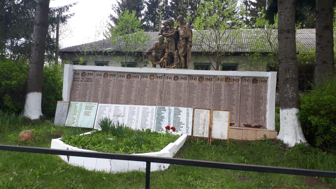 Надгробное сооружение, установленное в начале 70-х гг., представляет собой скульптурную группу: трое солдат в натуральную величину. Центральный держит ребёнка на руках, в левой руке солдата, стоящего справа- каска; солдат, стоящий на коленях слева, возлагает венок; установленную на постаменте в форме параллелепипеда. Общая высота 4 м., размеры основания постамента 1,15Х 1,15. Площадь сооружения- 6,7 м.кв.