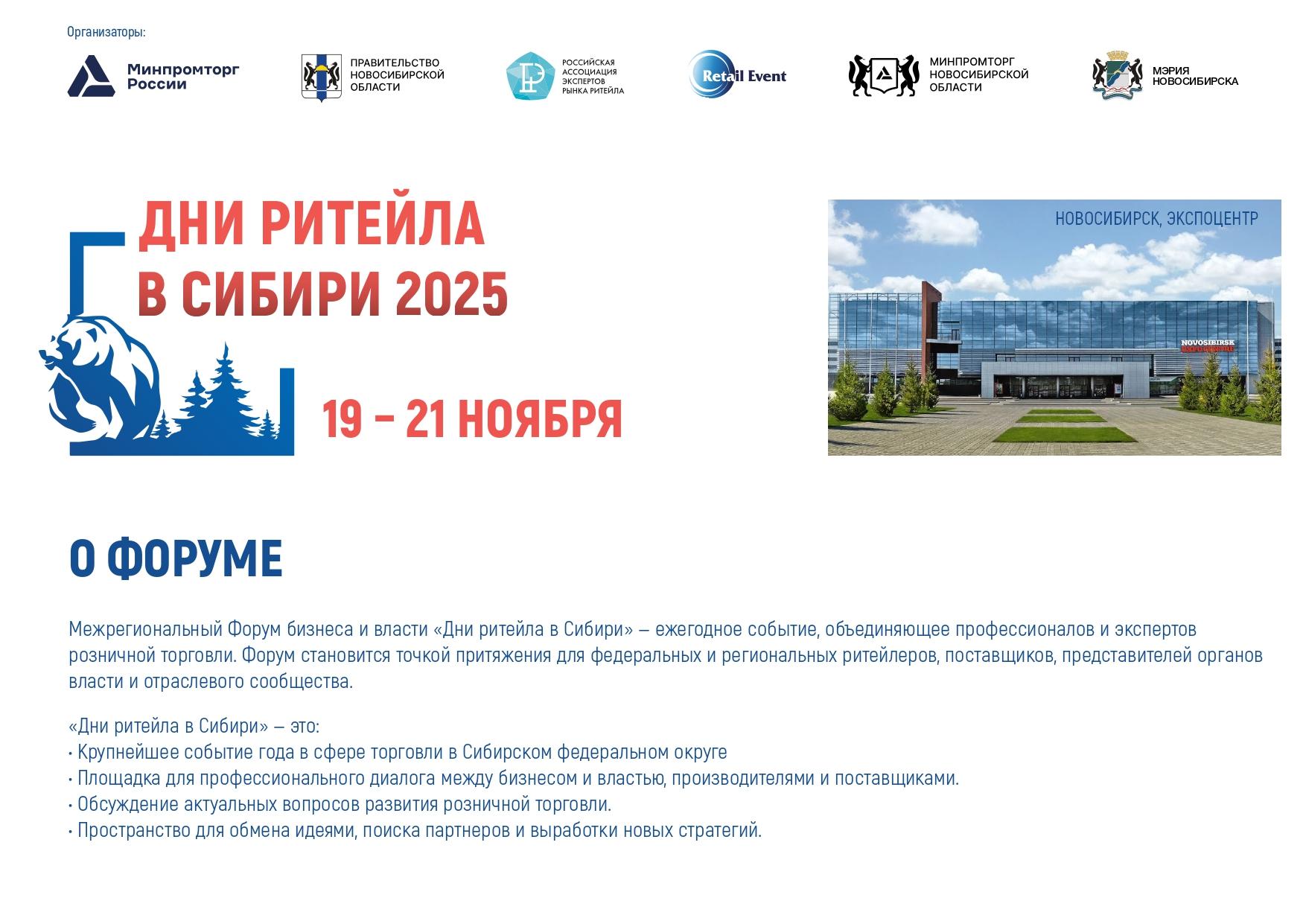 С 19 по 21 ноября 2025 года в Новосибирске состоится ежегодный Межрегиональный форум бизнеса и власти «Дни ритейла в Сибири» — событие, которое не просто собирает профессионалов ритейла, но и задаёт тон будущему российской торговли! В прошлом году Форум объединил более 5000 участников, став ключевой площадкой Сибирского федерального округа для обсуждения стратегий и идей развития отрасли.