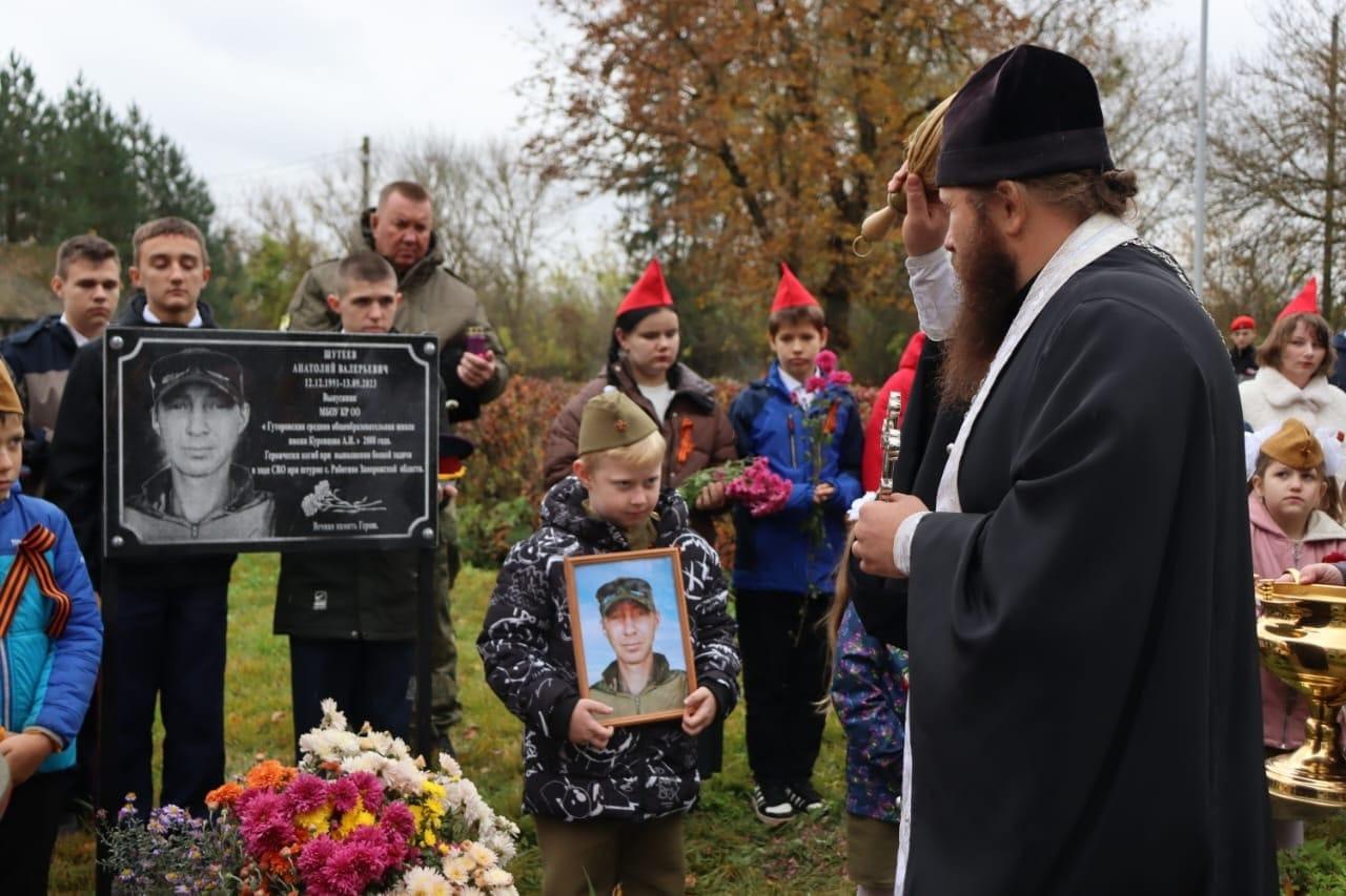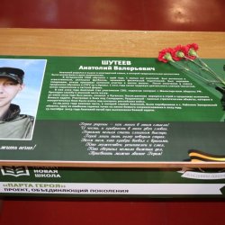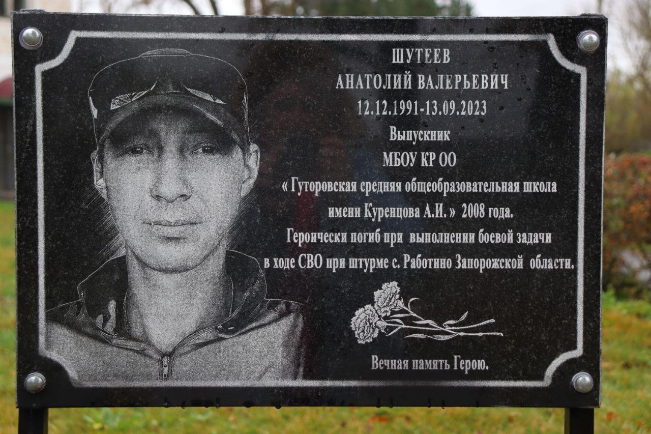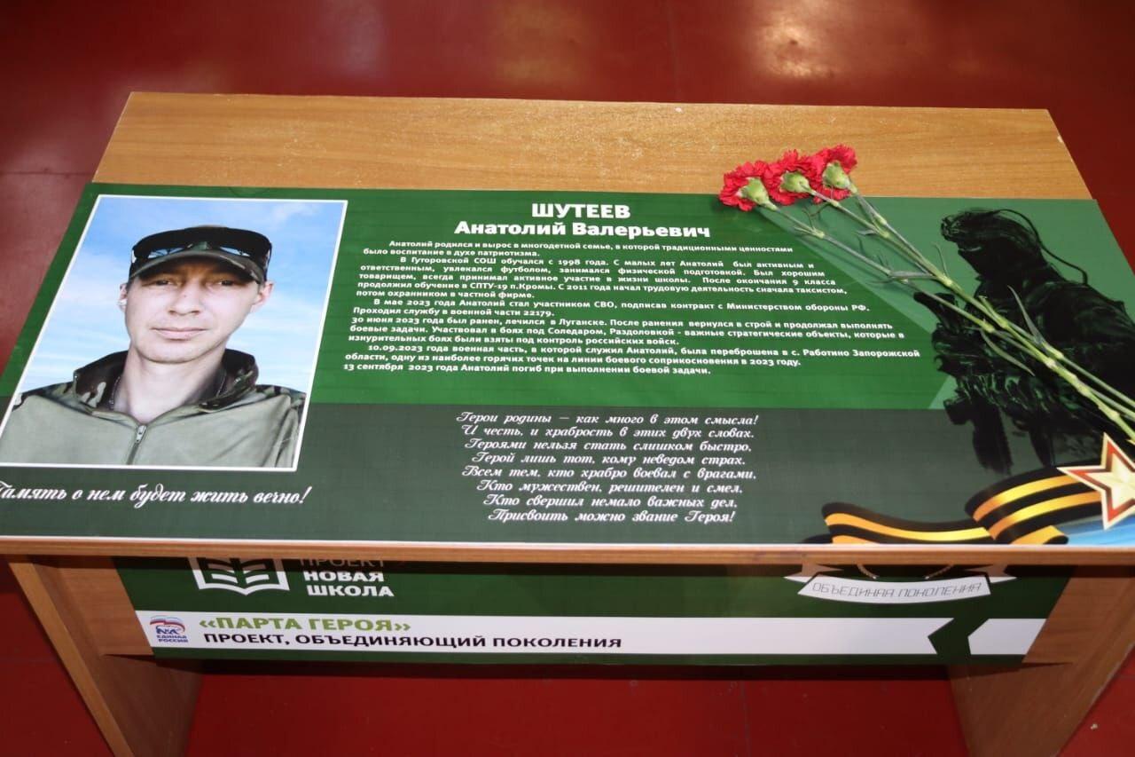 15 октября 2025 года, на территории МБОУ «Гуторовской СОШ им. Куренцова А.И. состоялось торжественное событие – открытие доски и Парты Героя в честь выпускника школы Анатолия Валерьевича Шутеева, погибшего при исполнении воинского долга в ходе специальной военной операции. Это событие – дань памяти и глубокого уважения нашему земляку, который навсегда останется примером мужества, стойкости и беззаветной любви к Родине. Важно, чтобы молодое поколение знало своих героев, гордилось ими и ровнялось на их подвиг. В мероприятии приняли участие, Глава Кромского района А. И. Усиков, учащиеся школы, педагоги, почетные гости.